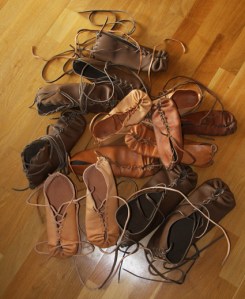 Et utvalg fottøy til Steinalder- og bronsealderdagen. Basert på sko fra Kvitingskjølen (eldre bronsealder) og støvel fra Leksvik (førromersk jernalder).