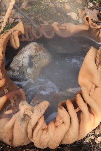Vi ser at her er potensiale for forbedring av gryten, den kunne nok ha vært strammet litt mer og og burde hatt høyere kanter. Skinnet ble forbausende stivt på kort tid, men de lave kantene gjorde at vannet lett rant over kantene. Det ble fyllt på med steiner, og ideelt sett burde også steinene vært tatt ut ettervhert som de hadde avgitt varme slik at det ble plass til væsken i gryten.