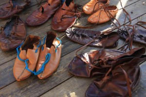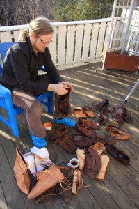 Vi har alt en hel rekke jernaldersko, så denne gangen slipper vi forhåpentligvis å lage så mange nye, men de gamle trenger ettersyn. Espen setter skoene inn med fett eller olje for å forlenge levetiden, og må nok igang med litt småsømmer for å stoppe rifter og flenger. Heldigvis er det ingen som må såles om denne gangen.