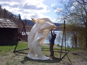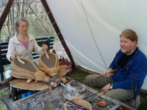 Det er ikke bare stridsfolket som forbereder seg til morgendagen, også et par håndverkere er i ferd med å rigge i stand. Hordamuseets egen Ole Mikal og Karianne er etterhvert drevne glassperleprodusenter, og er i gang med å sette opp telt og prøve ut den nye glassperleovnen.