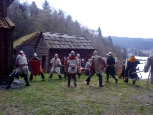 Det er først i morgen at Jernalder- og Mellomalderdagen er, men noen er alt på plass. Kongshirden har fylkes på Bjorvollen og tilbringer denne flotte vårdagen med trening før morgendagens oppvisning. Litt spesielt i dag er det at vollen og klyngetunet vrimler av fortidsmennesker, og det er lite innslag av moderne folk. I morgen vil det nok vrimle av begge deler.