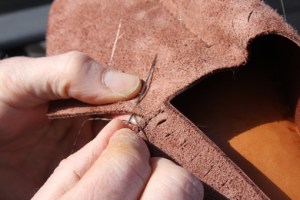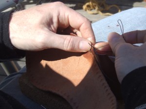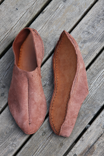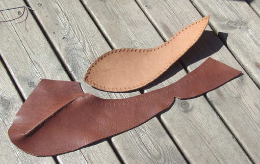 Espen er endelig i gang med å lage sko, en av hans favorittaktiviteter innenfor de ulike håndarbeid han utøver. Det ble vikingtidssko, eller også som de brukte i tidlig middelalder.