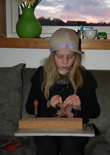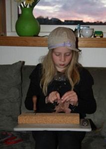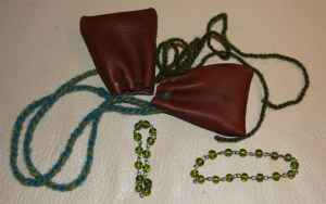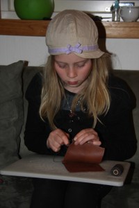 Oline ville til og med være med og drive litt håndarbeid som forberedning til Bjørgvin Marknad. Hun ville lage små skinnpunger, og fant dessuten glassperler som kan gjøres om til fine armbånd, eller bare brukes enkeltvis.