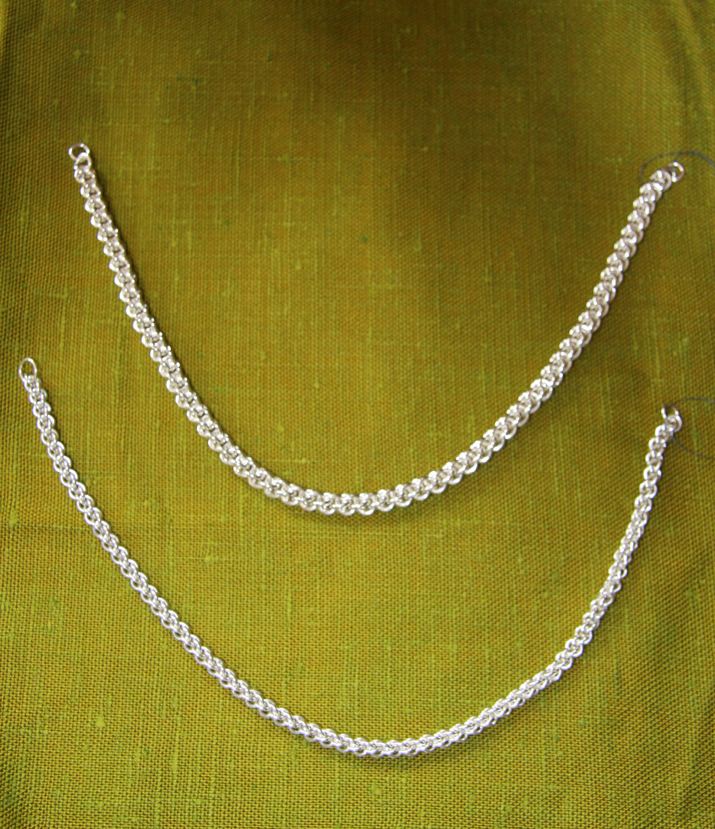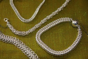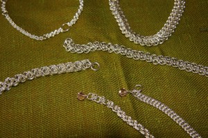 Våre varer er klare til å bys frem, i tillegg til nålebunde ting, Espen sine sko og Oline sine småting vil vi også ha med oss håndlagete sølvkjeder laget i «ringbrynjeteknikk». Espen sin yngste bror har vist sine kunster, her er det nitidig og nøyaktig sølvarbeid, hvor han har laget ring etter ring og tredd i hverandre i mange ulike mønstre. Dette er en tradisjonell metode og alt er håndlaget. Noe av det er reine lenker, mens andre ting er variasjoner og moderne bruk av av denne ringbrynjeteknikken. Ikke helt autentisk dersom man skal kle seg opp tidsriktig, men riktig pene ting er det!