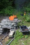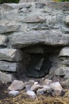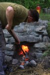 Nedre opning i ovnen er murt igjen med stein. Her fjernes steinen fordi ovnen skal forsegles med leire for å få mindre luftlekkasje