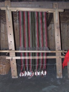 Den obligatoriske oppstadveven. Den er satt opp for å lage et rutemønstret stoff, slik man gjerne foretrakk.