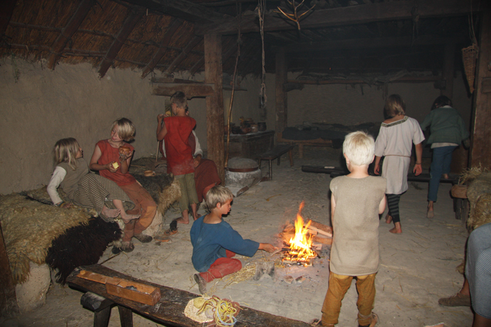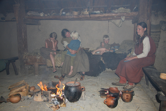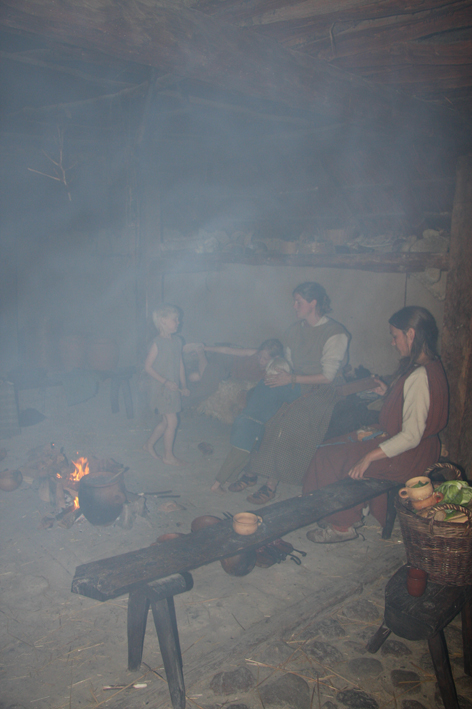Vi var glade for å ha fått prøve litt innendørs jernalderliv også på dagtid, men oppdaget fort at det var veldig bra at vi hadde hatt fint vær og kunne være så mye utendørs. Det opplevdes nokså trangt å være så mange personer innendørs samtidig, og ungene måtte passes på for ikke å tråkke på ildstedet eller gå i veien for matlagingen. Det var dessuten merkelig nok ingen bord i husene, som gjorde at benkene måtte brukes til å sette fra seg ting på, og det dermed ble lite sitteplasser. Forklaringen vi fikk var at det ikke var kjent noen bord fra jernalderen, bare krakker, benker og kister. Vi tror likevel at jernaldermenneskene må hatt bord. Det meste av både hus og inventar er tross alt basert på gjetninger, så hvorfor skulle de ikke hatt bord, noe annet ville vært upraktisk. Kunne de sette sammen en krakk og en benk, kunne de nok saktens også ha laget bord.
