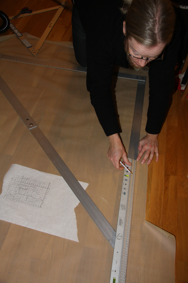 Espen tegner mønsteret opp i full skala. Dette er både plass- og ikke minst konsentrasjonskrevende arbeid.