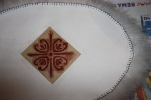 Lena har begynt enkelt, har delt opp et lite hvitt saueskinn og laget to deilige sitteunderlag. Det ene er firkantet, mens det andre er ovalt. Skinnene er kantet med teppesting. Vi sjekket opp en del sider for å finne ut litt om skinnfeller før vi satte i gang prosjektet, og fant fort ut at skinnfeller tydligvis ikke er skikkelige før de også har fått dekor på baksiden. Dette måtte prøves ut og vi gikk til anskaffelse av sjablonger og tekstilfarge.
