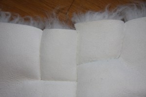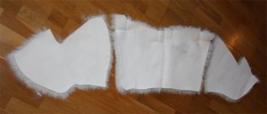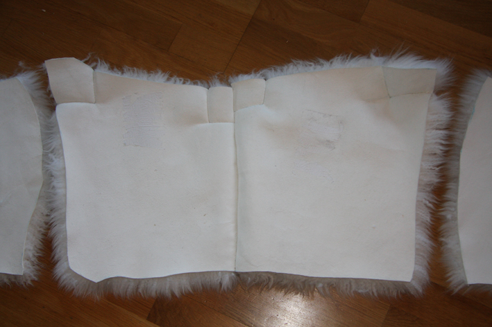 Espen er godt i gang med sitt første jernalders skinnslag. Etter å ha oppskalert mønsteret, ble det klippet opp og overført til selve skinnene. Slaget skal til slutt settet sammen av 34 ! forskjellinge stykker, store og små. Han har tatt utgangspunkt i de store hoveddelene, midtpartiet, og syr dem sammen stykkevis. Disse hovestykkene skal også ha en kant eller remse av småstykker øverst, og vil da få god passform rundt hals og nakke, den skal også forlenges i nedre kant med flere stykker. Vi ser at småstykkene som sys inn klart har en innvirkning på passformen, skinnet former seg fint der et helt stykke ville blitt stivere og rettere.