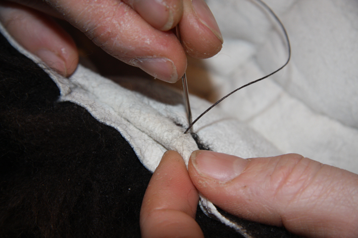 Dette er det andre skinnslaget i rekken, og sikkert det siste på en god stund. Et slikt prosjekt legger beslag på mye tid og krefter. På bloggen er det tidligere vist et litt mindre skinnslag med lys pels, «kladden» til dette. Begge er laget etter mønster fra et som er funnet i Sørgårds Mose ved Daugbjerg i Danmark, godt og vel 2000 år gammelt.