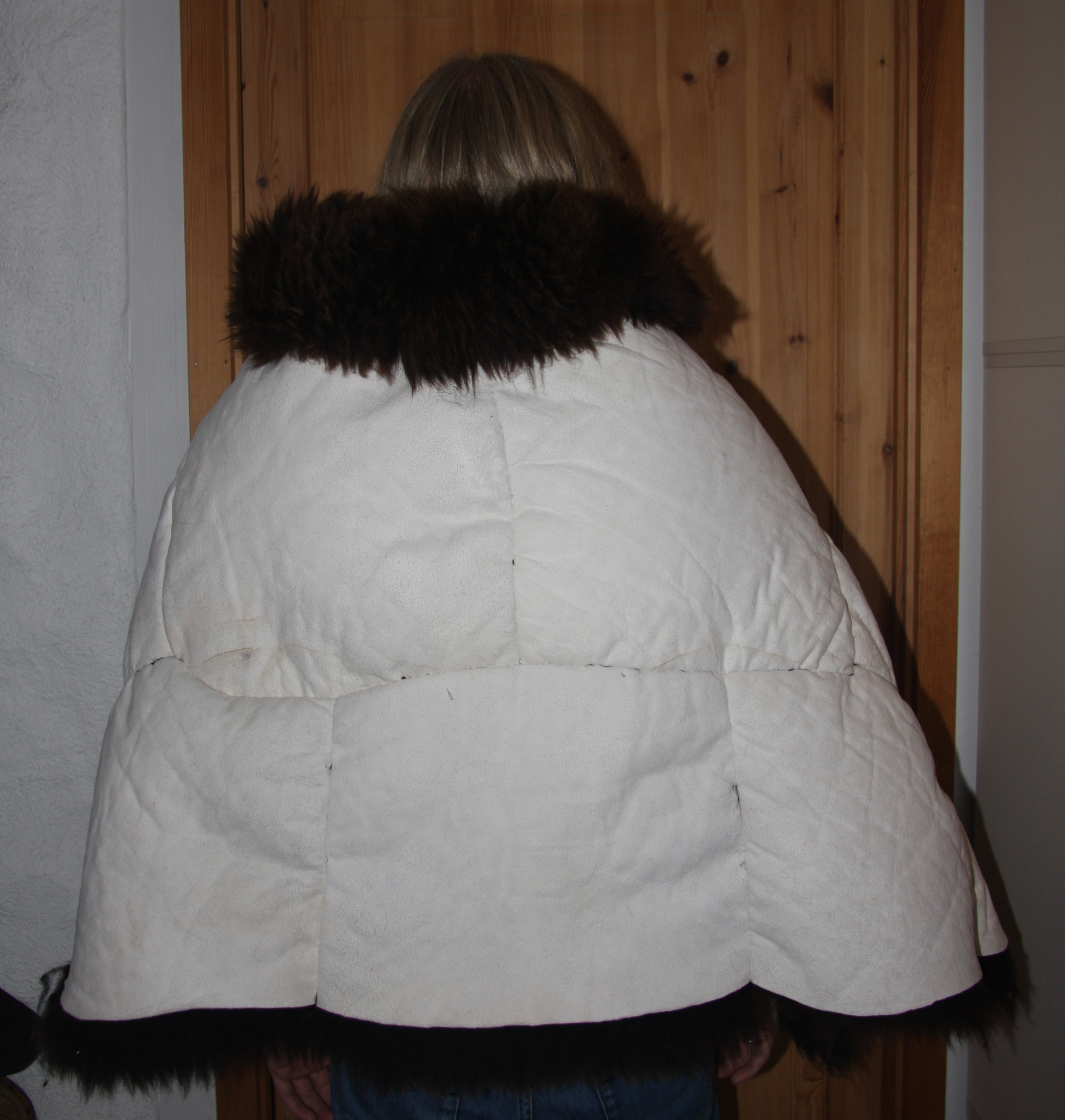 nesten tre digre sauefeller med brun pels i ulike nyanser, som gir en mer «jernaldersk» look og en livligere overflate på pelssiden. Den mykeste og fineste pelsen er brukt til kragen, som gjør det ekstra behagelig å ha på seg. Det faller ganske naturlig å brette ned kragen, og det tar seg best ut. Nå er det også brukt saueskinn til reimer, siden disse skinnene var mye mer solide enn de forrige som ble brukt. Tyngden på plagget og kraften som trengs for å knyte stroppene tilsier at man må skifte reimer fra tid til annen, så det er nok lurt å ha noen i reserve.
