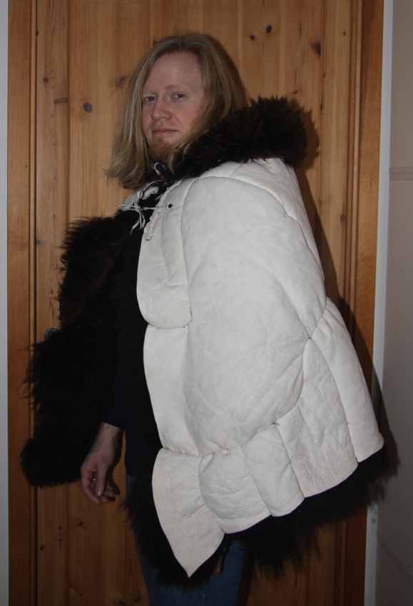 Man skulle jo gjerne ha vist frem plagget i full jernaldermundur, men alt slikt ligger igjen på Hordamuseet. Germanerne kunne jo angivelig gå ganske lettkledt under skinnkappene ifølge romerske kilder, men det passer seg ikke her. Vi ber derfor om unnskyldning for de moderne klærne på bildene. Mer tidsriktig oppdatering følger på nyåret.