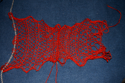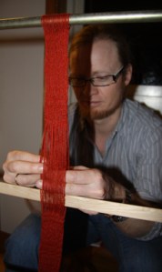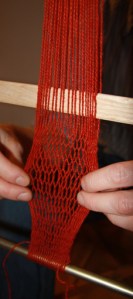 For en snau uke siden tok vi spranget (pling), og kjøpte en sprangramme fra Nodland Vevstol. Den har muligheter langt utover det vi er interessert i, men det er kjekt med godt verktøy. Målet er å lage et eldre jernalders hårnett, med utgangspunkt i et funn fra Bredmose ved Arden i Danmark. Først gjorde Espen noen enkle forsøk for å øve inn teknikken. Deretter var det klart for en prøvelapp i fint vevgarn, i samme mønster som hårnettet fra Bredmose. Det er den vi presenterer her. Forhåpentligvis kommer vi i gang med første hårnett i løpet av helgen.