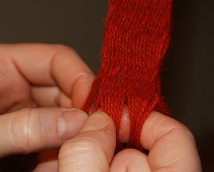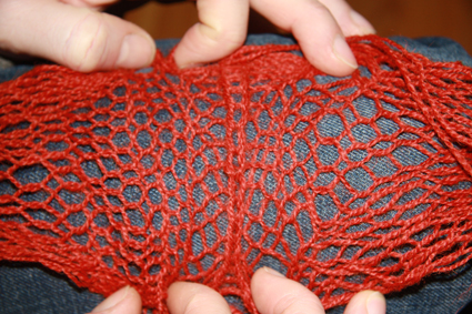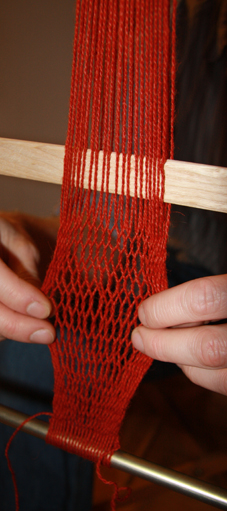 Sprang, som også kalles bregding, er en slags mellomting mellom fletting og veving. Man benytter en ramme med renning, som i en vev, men kutter ut innslagene. I stedet slynger man over- og undertrådene parvis over hverandre, noe som gir et nettmønster, og dermed stor elastisitet. Med litt googling får man mer utfyllende forklaringer, så vi holder oss til denne knappe beskrivelsen.