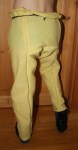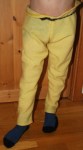 Buksebena skal være tettsittende, og er derfor skåret diagonalt av vevretningen, fordi dette gir mer elastisitet, ellers ville de fort slites i stykker. Originalen er i fin diamantkyper, et kostbart stoff i yngre romertid. Vi  har i stedet valgt å bruke et enklere ullstoff, i vanlig lerretsvev, siden buksene skal være til barn. Vi må anta at ulike gulfarger har vært vanlige på klærne i eldre jernalder. Buksen er selvsagt sydd for hånd. Alle stykkene er først kantet med teppesting, for at de ikke skal rakne, og deretter sydd sammen med Thorsbergsøm, en av de vanligste stingtypene fra eldre jernalder. Buksen er laget så stor at Malvin ikke vokser fra den til i sommer.