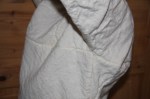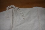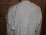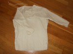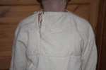 Folkevandringstidstrøyen til Malvin er nesten ferdig. Fasongen er basert på den svenske Högom-trøyen, som er det best bevarte skandinaviske plagget fra folkevandringstiden, og som skiller seg vesentlig fra romertidens plagg. Halsåpningen er den detaljen som er mest usikker. Delene foreligger, men man vet ikke sikkert hvordan de var festet. Vi har valgt en splitt et stykke nedover på ene siden foran (Slike sidelukkinger er kjent fra yngre jernalder).