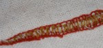 Högom-trøyen er sydd sammen med en avansert og tidkrevende søm, med ulike rekker sting, og etter alt å dømme med tråder i flere farger. Etter noen forsøk (tja, den var vel faktisk omtrent halvferdig), ble vi enige om at den ble for voldsom på en barnetrøye, rekket opp, og valgte i stedet den enklere Thorsberg-sømmen, som også har vært brukt i folkevandringstiden. Splittene i ermene og sidene ble sydd ned med flere rader med ulike sting, som på originalen.