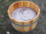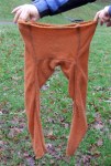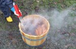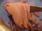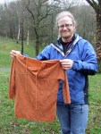 Det gikk utrolig fort å varme opp vannet med kokstein, og det var lett å holde ved like temperaturen. Vi bare la oppi en stein i ny og ne. Termomenteret vårt takket for seg i går kveld, under beisingen, så vi var virkelig hensatt til å føle oss frem. Hvis temperaturen overstiger 70 grader utskiller krappen brunlige fargestoffer, i tillegg til de røde. Fordi vi hadde lite fargestoff i forhold til tøymengden visste vi at fargene ikke ville bli veldig sterke, og gikk derfor inn for å få frigitt noe av det brune også. Etter to timer i fargebadet, endte tøyet opp med en mellomsterk brunoransje farge.