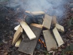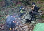 Først fyrte vi opp et bål, og lå på en mengde nevestore stein. Etter vel en time var steinene varme nok til at vi kunne starte fargingen. I stedet for å farge kjortelen alene og buksene på etterfargen, bestemte vi oss for å ha i buksene i samme slengen. Siden vi var så seint ute, var det eneste måten å få farget alle plaggene vi hadde med. Dermed gav vi avkall på sterk rødfarge på kjortelen, men vi håpet at det var fargestoff nok til at alle plaggene fikk en grei farge.