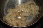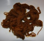 Vi prøver først i liten skala, med garnet vi kan tenke oss å sy drakten med. Garnet ble beisetmed alun i går kveld. Bark av trollhegg (som vi nettopp har fått i posten) ble lagt i bløyt i dag formiddag, likt vektforhold mellom tråd og bark. I kveldingen satte vi på gryten og en time seinere har vi fått en grei brunfarge. Neste gang tar vi dobbel mende bark og regner med å få en fin og mørkere farge.