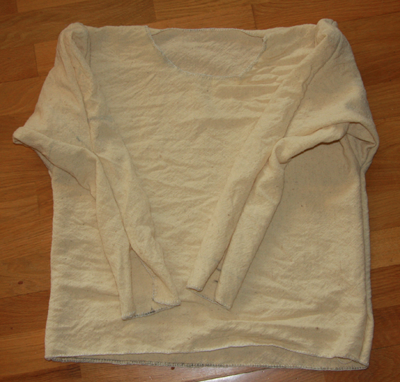 Lena har fått en langarmet skjorte til å bruke sammen med skjørtet eller under peploskjolen. Den har kiler i skulderpartiet, som man kjenner fra flere plagg fra folkevandringstiden. Riktig nok er detaljen hentet fra mannsplagg, men det er rimelig å tro at kvinnene også ønsket komfortable overdeler. Den skal farges i kveld eller i morgen, og deretter skal kantene sys ned med to-tre rekker med fargete tråder, for å live den litt opp. Til sist skal den få to spiralformede hekter i hver av ermeåpningene, og muligens brikkevevde bånd.
