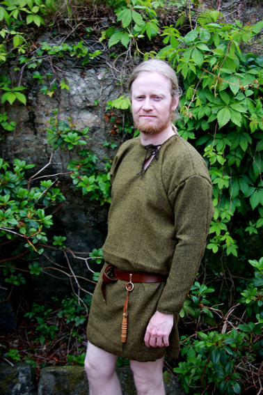 Ja, den ble ganske vellykket. Hadde jo mest lyst på en med mange hekter, men det er umulig å få fatt i avansert folkevandringstidsbling. Jepp, det er et fyrstål som henger fra beltet. Skulle jo helst innfattet en spissoval kvartsittstein i beltet til å slå stålet mot, men det får bli til en annen gang…