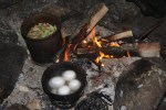 Kokekarene var spannformede leirkar av relativt beskjeden størrelse, slik at vi måtte fordele maten på to eller flere leirkar. Flere små leirkar koker fortere enn ett stort. Siden varmen kommer fra siden må leirkarene snus og vendes på hele tiden for at maten ikke skal brenne fast i karveggen. De spannformede leirkarene har iblant hatt jernhank, som tyder på at de også kunne henge over varmen, men karene vi brukte hadde ikke dette.