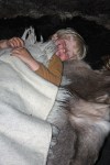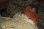 Malvin (7) fikk låne seg et kjempestort elgskinn til å sove på, og sov rett på dette, og bare iført (den moderne) bokseren sin. Over seg hadde han saueskinn, en vevd ullfell, iblant med kappen sin på toppen. Det meste av dette falt av i løpet av kvelden og natten, fordi han er nesten like mye i bevegelse når han sover som når han er våken. Heldigvis er han ikke særlig frostig av seg.