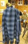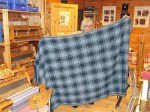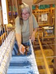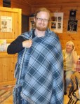 Heldigvis er redningen underveis. Espens gode venn og kollega fra Hordamuseet, veveren Kari Thue, har i løpet av det siste året brukt uendelig mange timer på å lage en standsmessig kappe basert på Thorsbergkappen og andre praktkapper fra eldre jernalder. Kari ringte forleden dag for å si at kappen var klar til å tas av veven, og inviterte hele familien til å overvære det høytidelige øyeblikket. Det var en tanke nervepirrende da saksen begynte å kutte renningen, men det gikk fort over. Snart kunne tøyet spoles av veven, og vi fikk ta det fantastiske plagget i øyensyn. Kappen er vevd i diamantkypert, av tynt, enkeltspunnet garn, med rutemønster i tre nyanser av blått, og med brikkevde kanter. Espen måtte selvsagt prøve den på med en gang. Nå gjenstår «bare» fletting og tvinning av frynsene, og så er kappen klar til å tas i bruk.