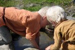 Vi var litt spente på hvordan det ville gå med å sysselsette de to guttene gjennom uken. Hvis de kjeder seg har de en lei tendens til å ryke i tottene på hverandre. Heldigvis fant de på mer enn nok å gjøre. Guttene våre er veldig glade i å sutle med vann, en syssel de lett kunne ta med seg til jernalderen. Det gamle oppkommet, der gardsfolket i jernalderen hentet vann for 1500 år siden, viste seg raskt å bli hovedattraksjonen for de minste. En annen stor hovedsyssel for guttene var spikking. Vi gikk alle med kniver, og selv minstemann er etter hvert blitt en habil pinnespikker. Barna laget selvfølgelig barkebåter og andre ting til å leke med i oppkommet.