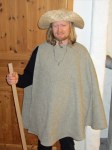Espen har fått spørsmål om han kan skaffe en middelaldersk pilegrimskappe til en utstilling. Skaffe måtte i dette tilfellet bli å lage, fordi vi ikke har noen kappe å avse i månedsvis. Etter en liten jakt i hyller og kasser fant vi et stoff som passet bra: et tykt, kraftig valket, grått ulltøy. Dette er faktisk et stoff vi har funnet på Fretex, gammelt og av høy kvalitet, men med noen større og mindre møllhull (ingen ting levende der nå heldigvis). Noen lapper og stoppinger gir bare patina til kappen, som helst bør se brukt ut. Kanskje bør den også patineres på andre måter? En pilegrimsferd må ha slitt hardt på klærne.