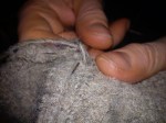 Kappen er halvsirkelformet, med en utskjæring for halsen. Den er sydd sammen over skulderen, slik at man må tre den over hodet. Åpningen er i siden, perfekt for pilegrimens stav. Alle sømmene er sydd for hånd, slik Espen foretrekker, i håndspunnet ullgarn i samme farge, også funnet på Fretex. Det er ikke bare i myrene man kan finne kule ting 😉