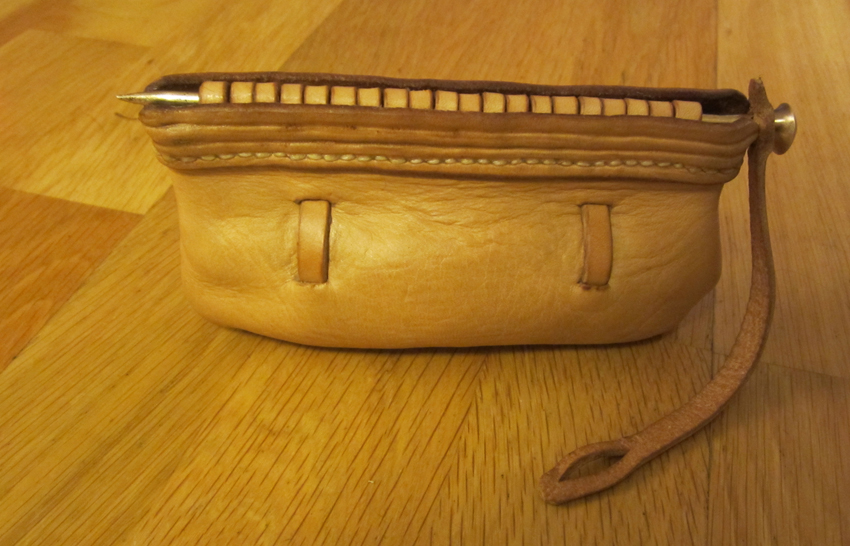I kveld fikk Espen hentet frem bronsealdertasken for å gjøre ferdig de siste detaljene. Åpningspartiet har vært dekorert med omgående riller. På de gamle tegningene ser det også ut til å være en rad med tverriller, men disse er ikke så fremtredende på foto av tasken. Kanskje tegneren feiltolket stingene som holdt sammen åpningspartiet? Vi holder inntil videre en knapp på denne forklaringen. Gjett om denne tasken skal granskes neste gang vi er i Danmark!! Beltehempene er også på plass. Vi vet ikke hvordan de var festet på innsiden, men har gått for en T-formet avslutning i begge ender av hempene. Litt bale å få igjennom, men en enkel måte, og de sitter godt. I hodet på låsepinnen er det festet en liten rem. Kanskje denne har vært en sikkerhetsstropp for å hindre nålen i å gå tapt? Alternativt er den der kanskje for å kunne trekke nålen lettere ut. Denne glidelåspatenten er nok ganske ømfintlig for temperatur- og fuktsvingninger.