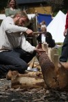 Olav i gang med å kløyve en stor tømmerstokk på vikingvis, med hammer og kiler. Deretter skal den bearbeides ved hjelp av spretteljing, en huggeteknikk som forsvant med Svartedauden. Siste finpussen gjøres med en skjøve, en eldre slektning av høvelen.
