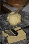 Vi slo saupen (vesken som skilles fra smøret) over i et spann. Denne kan det lages saupgraut av, en mild og mager type rømmegraut, siden fettet er skilt ut i smøret. Etter saupen var slått av ble smøret skylt med reint vann flere ganger, og klumpene ble pakket sammen til en hel masse. Vi måtte skylle helt til vannet ble klart. Etterpå var det viktig å «vri» ut så mye vann som mulig også. Det er viktig å få ut vannet før saltingen, siden salt binder vann, og mye fukt i smøret vil gjøre det mindre holdbart og gi for myk konsistens. Siste del av prosessen er å salte smøret, både for smak og holdbarhet. Da gjensto det bare å smake på produktet: Et tykt lag ferskt, smakfullt smør på flatbrød. Vi var riktig fornøyde med resultatet.