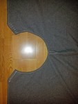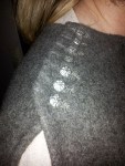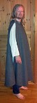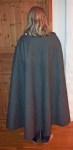 Espen startet med en kappe til seg selv. Han kjøpte 3 m med tykk, grå vadmel fra History-Wholesale på vikingmarkedet på Herdla i juni. På lørdag ettermiddag klippet han et halvsirkelformet stykke, med diameter på 150 cm. Utgangspunktet var Bockstensmannens kappe, fra midten av 1300-tallet. Espen har laget en slik før, til en pilegrimutstilling på Bergen Museum. Den er åpen i siden, slik at man kan holde en stav eller håndtere et våpen. Originalen var sydd sammen over skulderen, men Espen valgte denne gangen å holde den sammen ved hjelp av knapper i stedet. Ikke fordi det er praktisk, selv om det sikkert kan være det, men fordi det er en fiffig detalj. Litt bling skal man unne seg. Ellers er det ikke noe pynt, verken bånd, broderier eller prydsømmer (Kanskje den med tiden får en rad eller to med prikksøm i halsen og i nedkant). Dette er først og fremst ment som et praktisk plagg.