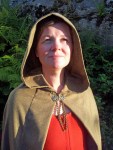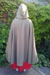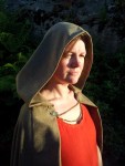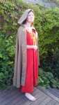 Vi satset på nok en halvsirkelformet kappe. De mer omfangsrike kappene, 3/4 sirkel eller helt sirkulære, passer best til seinmiddelalderen og renessansen, og de er dessuten veldig materialkrevende. Lena ønsket denne gangen en hette sydd i ett med kappen. Den er ikke så ulik struthettene, men uten slaget, og med rynker langsetter sidene for at den skal passe i den relativt trange halsåpningen, til tross for at den er omfangsrik. Til lukking i fronten har den fått et par hekter Espen kjøpte på middelalderfestivalen i Hamar, samt et kjede for at den også skal kunne henge løsere.