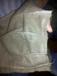 Lena er en frysepinn, og den av oss som er først ute med å trekke på seg en kappe. Det var hun som presset på for å få laget middelalderkapper i år. Vi fant frem et stoff vi har hatt liggende lenge, gråbrunt, i veldig tynt, valket toskaft. Det har tidligere vært brukt til en barnekjortel. Fordelen med en tynn kappe er at den ikke veier så mye (Espens middelalderkappe er til sammenligning veldig tung), og så flagrer den fint og faller meget pent i mange folder. Vi får håpe at den er varm og tett nok. Alternativt får vi fore den.