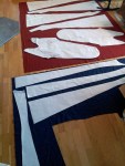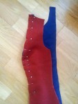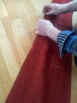 Denne uken klarte vi endelig å sette av litt tid til prosjektet, til tross for at vi hadde mange andre baller i luften. Espen laget mønster onsdags- og torsdagskvelden. Det knyttet seg stor spenning til om det var nok igjen av det pene, blå og røde kledet vi kjøpte fra Handelsgillet for to år siden. Det gikk – så vidt. Front- og bakstykker blir blå, mens sidene og armene bli røde. Nå i dag fikk Espen krittet opp og klippet ut alle stykkene, og så gikk stafettpinnen til Lena, som sydde sammen de lange sømmene med maskin. Aller helst ville vi gjort alt for hånd, men tiden strekker bare ikke til denne gangen. Sømrommet og kantene rundt åpningene skal i alle fall sys ned for hånd, og det er i grunnen jobb nok i seg selv. Til neste år er den vel for liten den også…
