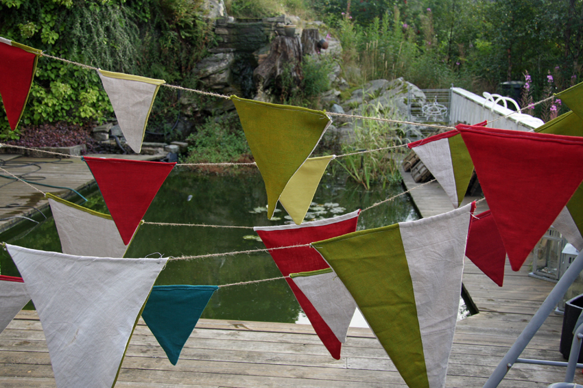 Nå har vi klar flere rekker med fargerike vimpler, 36 trekanter fordelt på tre lange lenker og 12 store trekanter fordelt på to lenker. Vi har gjort et bidrag til at det skal bli festpyntet og fint på Bergenhusdagene 8. og 9. september.