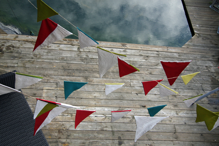 Å komme til et marked prydet med fargerike vimpler som blafrer i vinden er med på å gi en følelse av middelalderfest og god stemning. Lena tok saken i egne hender, og satte i gang produksjon. Vi har brukt noe ubleket lin og noe farget, og forsøkt å fordele så godt vi kan. De fleste er forskjellig på frem og bakside, og enkelte av vimplene er delt i to farger på langs. På de store vimplene fant vi ut at det gikk å sy dem sammen, og så legge og stryke på tvers før de ble festet på hampetauet som utgjør lenkene.