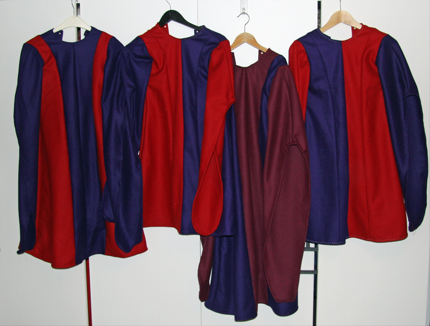Vi har laget to små kjoler str 5 år, med rød og lilla med motsatt halvpart til hverandre. Den midterste er kjole med med lilla midtparti ca str 6-7 år, og den største lilla med burgunder midtparti og ermer, til de størst slottsførkene på ca 9-10 år.