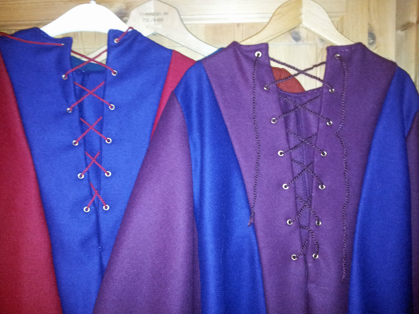 Så var vi endelig ferdige med de siste kjolene og en brikke til falt på plass til Bergenhusdagen. Disse kjolene er barnestørrelser og en forenklet utgave av den flotte kjolen vi laget til Oline. Her har vi måtte i større grad ty til maskinsøm, men alle synlige sømmer er gjort for hånd. Vi valgte også å prikksy rundt halsåpning og nede rundt kanten med en dekorativ tråd i en annen farge eller ton i ton med kjolestoffet. Prikksømmen brukte vi til samtidig å legge opp kanten. Klokkeermerne er sydd inn for hånd rundt hele kanten, men med usynlig søm. I ryggen har vi brukt maljer i messing og vi har tvinnet en tråd for å stramme.