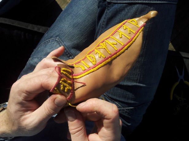 Originalskoen er godt bevart og dokumentert, men etter over 800 år i jorden har den mistet fasongen litt. Etter noe prøving og feiling kom Espen frem til et gangbart mønster for såle og overlær. Runene og de andre mønstrene ble først tegnet på med blyant, og deretter skåret inn med en skalpell. Det var skremmende å skjære i det tynne skinnet, med tanke på at det bare skulle skjæres halvveis gjennom, men det gikk forbausende bra. Deretter ble skoene sydd sammen og vrengt, før det var klart for broderiene. Den ene skoen er så godt som ferdig, med unntak av noen få uklarheter i mønsteret, og Espen har nå begynt å brodere på den andre.