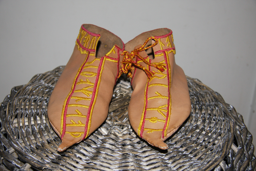 Dette er ikke sko til eget bruk, men et oppdrag fra kolleger i Bymuseet i Bergen. 19. oktober åpner Bryggens Museum en utstilling om sko. Der skal Espens sko stilles ut sammen med originalen, en sko funnet på Bryggen i Bergen, fra slutten av 1100-tallet. Fordi originalen ikke har bevart noen rester av tråden, har Espen valgt fargene selv. Både rød og gul later til å ha vært vanlige farger på sko med silkebroderier. Det er viktig at publikum får et inntrykk av hvordan skoene kan ha tatt seg ut dengang den stolte eier tok dem på seg første gang. Vi får tro at de var en gave fra en beundrer eller en forlovelses- eller bryllupsgave.
