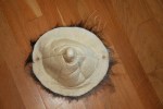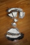 Espen har brukt kapp fra villsaufeller, som har vært brukt til andre formål. Man bør aldri kaste noe man kan få bruk for en eller annen gang… Det er nesten en skam å vende den vakre pelsen inn mot hodet. Det måtte også skjæres av noen centimeter med ull for at luen faktisk skulle kunne gå ned på et hode. Denne luen er laget like stor som originalen, og Tollundmannen hadde åpenbart litt mindre hode enn Espen, i tillegg til at håret hans var svært kortklippet, men på grunn av lissene sitter den ikke så aller verst allikevel. Inntil han får laget seg en litt større, får den gjøre nytten. Meningen er å lage et flere luer, også andre varianter, slik at de kan brukes både av skoleelever og deltagere på arrangementer.