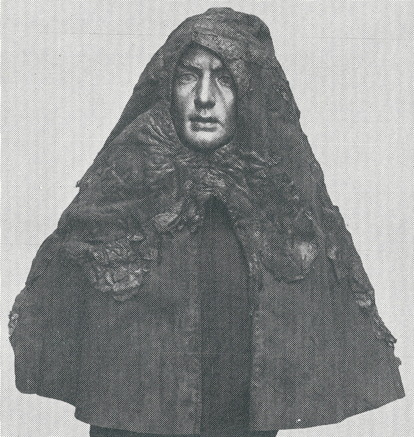 Originalen. Nederste del av fronten mangler, og er rekonstruert i antatt lengde (fra Elisabeth Munksgaard: Oldtidsdragter. Nationalmuseet (1974)). Dessverre et meget utydelig foto.
