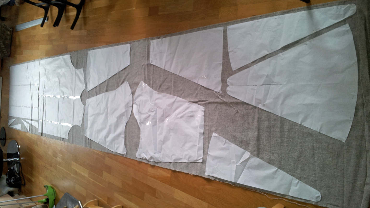 The picture shows about five meters of twill on the floor, with the pattern sheets on top. The separate parts are now cut out. After we have tested if it fits, the tunic will be stitched together by hand.