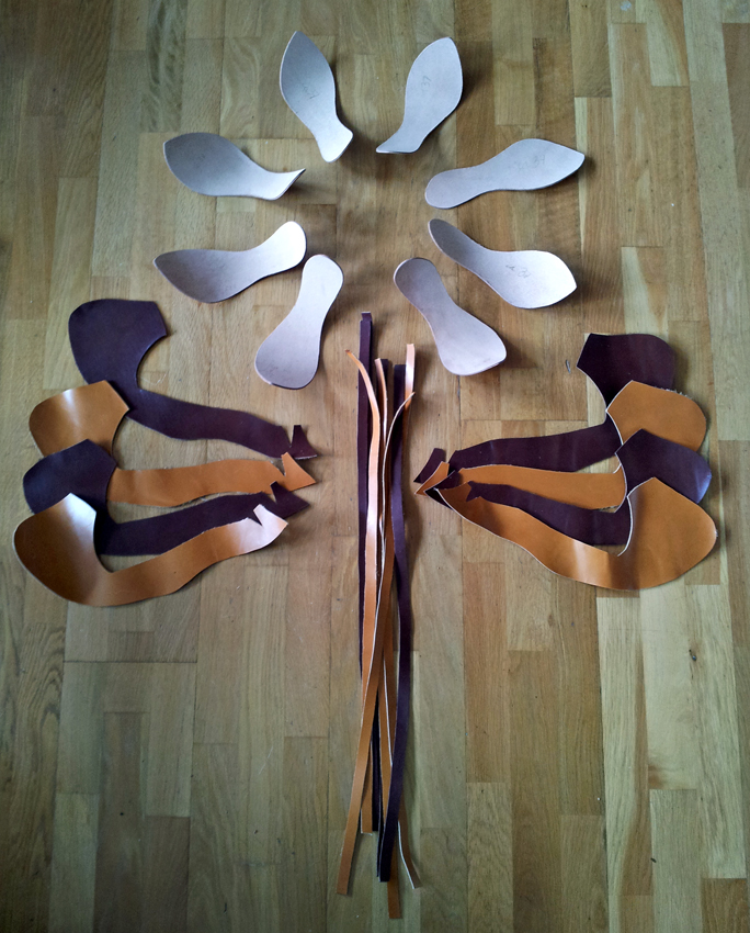 Vi pleier alltid å ha med oss noe håndarbeid på ferie. Ofte har det gått i nålebinding eller ett eller annet plagg dersom det har vært god plass. Nå har i alle fall Espen bestemt seg for å tone ned nålebindingen litt, og den beste måten å gjøre det på er ganske enkelt å la være å ta med garn og nålebindingsnåler. Det betyr imidlertid at han må ha med seg noe annet å drive på med på feriekveldene. Han er derfor nå i gang med å skjære til såler og overlær til middelaldersko. Når ferien er over er et ikke lenge til Bergenhusdagene, og da må vi jo ha noen tidsriktige sko til salgs i boden vår. Det kan nok også hende at Fortidsfamilien selv trenger noen nye sko, ikke minst guttene, som hele tiden vokser fra sine. Skodeler og grunnleggende skomakerverktøy tar ikke stor plass, og er lett å få med seg. I år blir det biltur til Danmark. Det betyr litt bedre plass enn i fjor, da vi syklet, noe som igjen innebærer at vi til og med kan ha med oss noen klesplagg å jobbe med. Når man brer et godt ullstoff utover fanget blir man ikke kald når man sitter utenfor teltet utover kvelden. Det er imidlertid viktig at vi får gjort unna selve målingen og klippingen, slik at bare sømmen gjenstår.